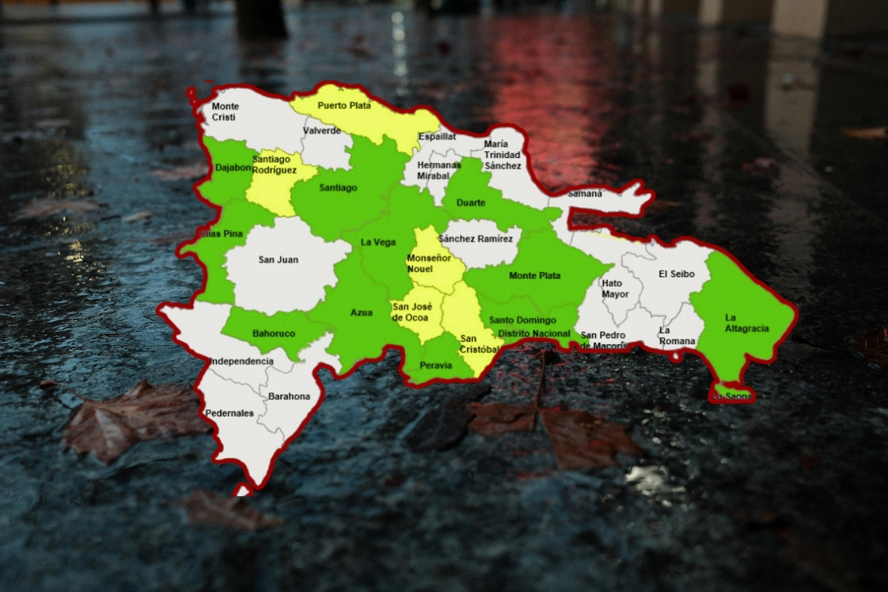 Las provincias en alerta amarilla son Monseñor Nouel, San José de Ocoa, San Cristóbal, Santiago Rodríguez y Puerto Plata, mientras que en alerta verde se encuentran Santo Domingo, Distrito Nacional, Barahona, La Vega, Santiago, La Altagracia, Azua, Elías Piña, Monte Plata, Dajabón, Duarte (especialmente el Bajo Yuna) y Peravia.