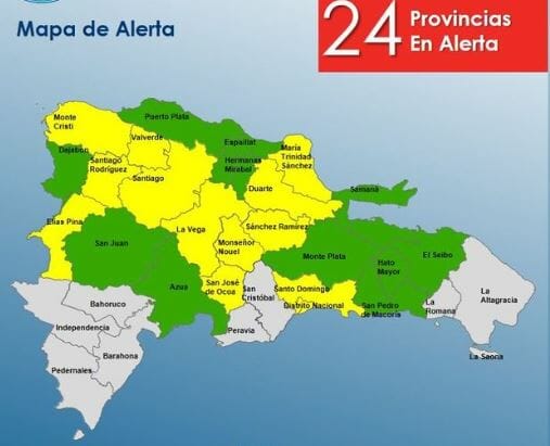 SANTO DOMINGO. – El Centro de Operaciones de Emergencias (COE) aumentó a 13 las provincias en alerta amarilla y a 11 las verde por posibles crecidas de ríos, arroyos y cañadas, así como inundaciones repentinas o urbanas, debido a que los efectos de una vaguada continuarán generando nublados y aguaceros con tormentas eléctricas y ráfagas de viento.
