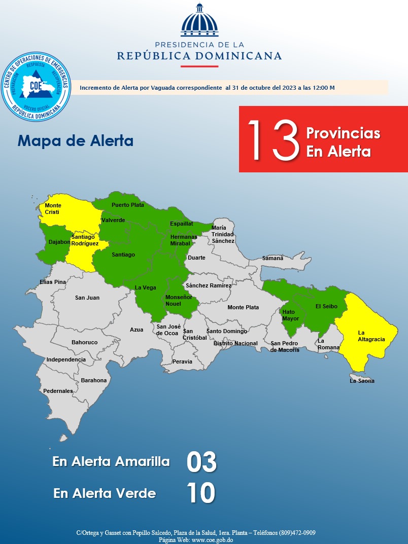 Santo Domingo. – El COE aumentó a tres las provincias en alerta amarilla y 10 en verde por posible crecida de ríos, arroyos y cañadas, debido a que la incidencia de una vaguada estará generando aguaceros, pero además por la posible coronación de la Ataguía del Proyecto de Construcción de la Presa de Guayubín.