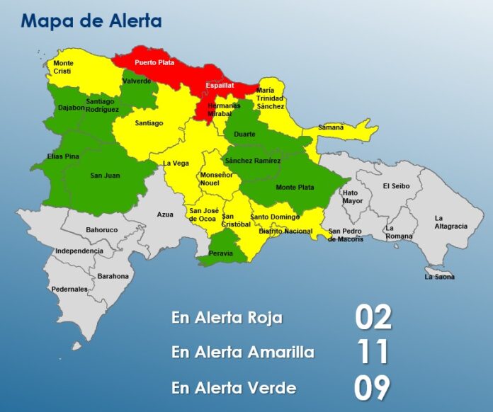 Las provincias en alerta roja son Puerto Plata y Espaillat, mientras que en alerta amarilla figuran, entre otras, Montecristi, Santiago, La Vega, María Trinidad Sánchez, Hermanas Mirabal, Samaná, San Cristóbal y el Gran Santo Domingo. En tanto, varias demarcaciones permanecen en alerta verde como medida preventiva.
