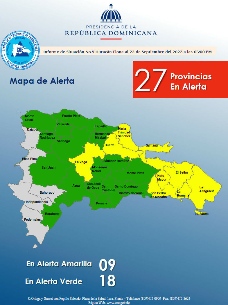 La institución indicó que 08 provincias se mantienen en alerta amarilla y 18 en alerta verde debido a que las condiciones del tiempo seguirán influenciadas por los efectos indirectos del huracán Fiona.