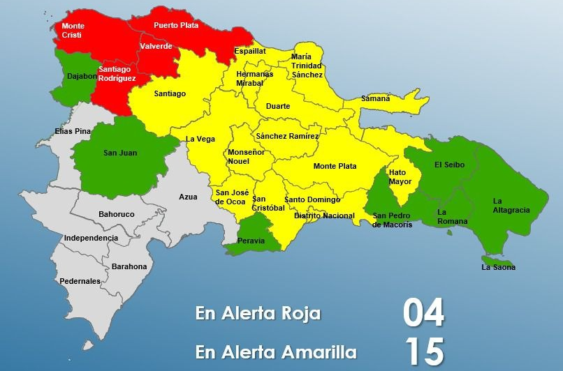 En alerta roja se encuentran Santiago Rodríguez, Valverde, Montecristi y Puerto Plata. Mientras que en amarilla figuran María Trinidad Sánchez, Santiago, La Vega, Duarte, San Cristóbal, Espaillat, Samaná, Hato Mayor, Santo Domingo, Distrito Nacional, Monte Plata, entre otras.