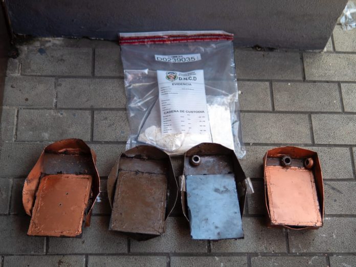 “Las cuatro láminas de la cocaína, fueron halladas en un doble fondo, preparado en la parte inferior de las macetas de metal, escondidas en fundas plásticas transparentes, para evitar ser descubiertos por las autoridades; la sustancia tuvo un peso aproximado a los 450 gramos”.