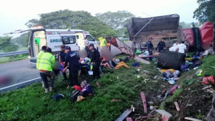 De acuerdo con las autoridades, a la altura del kilómetro 111 un camión que transportaba migrantes sufrió una volcadura luego de que presentara una falla mecánica en los frenos. Tras el percance, dos personas perdieron la vida y otras 38 resultaron heridas.