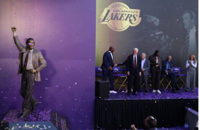 Riley, entrenador miembro del Salón de la Fama y actual presidente del Miami Heat, dirigió a los Lakers de 1981 a 1990, llevándolos a las Finales de la NBA siete veces y ganando los anillos de 1982, 1985, 1987 y 1988.Ahora ha sido inmortalizado en el exterior del estadio de los Lakers, en el centro de Los Ángeles, con una estatua de bronce, vestido con uno de sus trajes Armani favoritos y con el puño en alto.