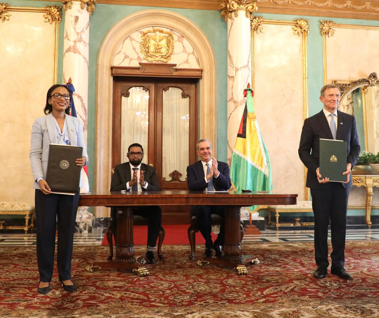 Los mandatarios dominicano y guayanés fungieron como testigos de la firma de los acuerdos, que confirman el objetivo y visión compartida de fomentar un entorno propicio que fortalezcan los lazos bilaterales, facilite una mayor colaboración empresarial y aumente el comercio en beneficio mutuo nacional.