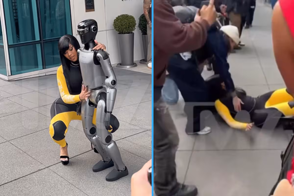 Tras algunos pasos de baile, Cardi B se inclinó hacia la máquina y hasta intentó besarla, cuando el robot —por razones que aún no están claras— pareció perder estabilidad y se deslizó directamente hacia ella.